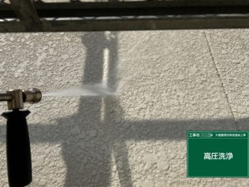 施工中のお写真です。外壁を高圧洗浄していきます。