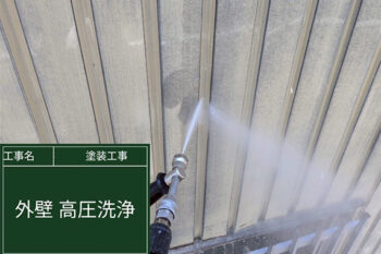 外壁に付着している汚れを高圧洗浄で落としていきます。