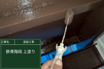 剥がれやすい鉄骨階段はローラーを使って細部まで塗装していきます。