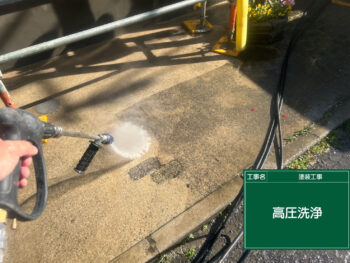 施工中のお写真です。高圧洗浄をして古い塗膜を落とします。