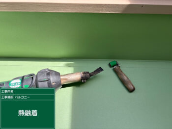 バルコニーの防水シートの接合部を熱で加熱し、シート同士を一体化させます。