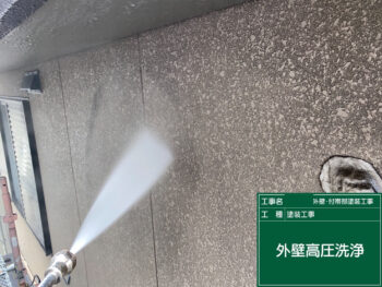 施工中のお写真です。高圧洗浄で汚れや塗膜を落としていきます。
