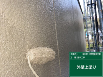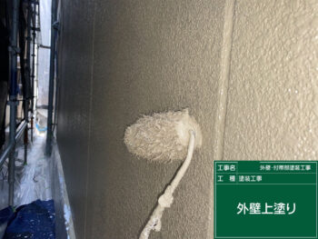 外壁上塗りでは塗布量にもこだわり耐久性を高めます。
